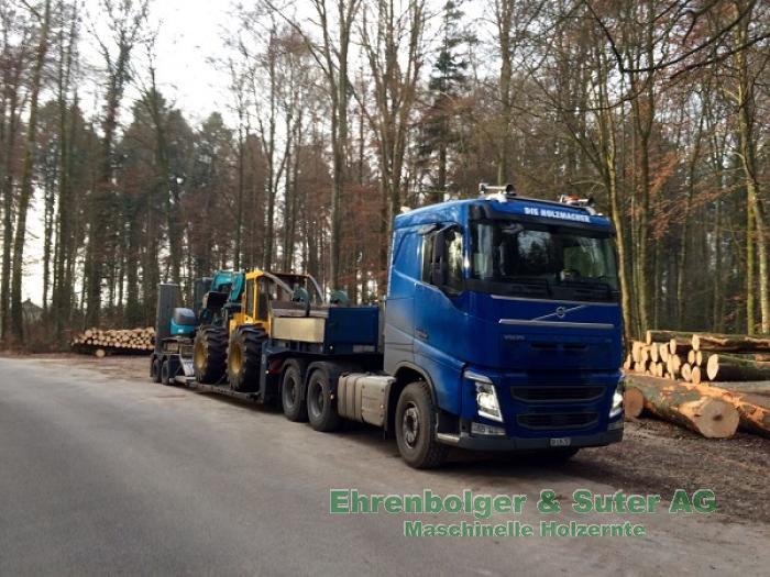 Mit unserem LKW-Volvo FH und dem Tiefbettsattelauflieger Doll Pather T2E, erledigen wir nicht nur den Transport unserer Forstmaschinen, sondern transportieren auch Maschinen und Geräte für Drittfirmen. Dank des abkoppelbaren Schwanenhalses, ist das Beladen des Aufliegers kein Problem.
